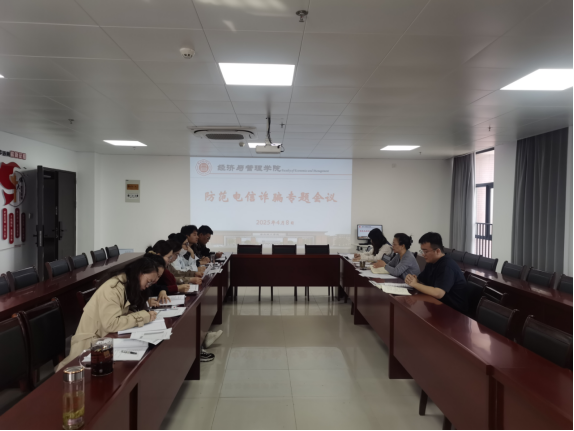 2025年4月8日,永利304官网唯一在行政楼725会议室召开本学期第七周学生管理工作例会暨防范电信诈骗专题会议,学院书记助理员禹辛、团总支书记王绎程及全体辅导员参会,会议由院长吴玲主持。