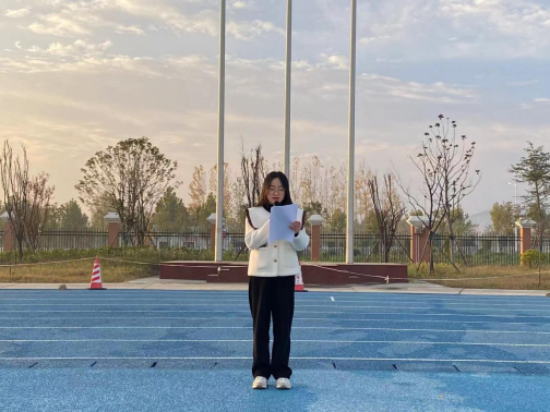 升旗礼毕后,由新进教师代表李莜莜进行“踔厉奋发、勇毅前行”系列主题演讲---国旗下的新征程。她在讲话中指出,新时代的青年既生逢其时,也重任在肩,既是追梦者,也是圆梦人。有责任、有担当、有奋斗、有奉献的人生,才是有意义的人生。我们要以崭新的姿态、坚定的毅力、饱满的热情,意气风发奔赴“充满光荣和梦想的远征”,谱写新时代的璀璨新篇,为自己的人生加油喝彩,为学校的发展贡献力量,为祖国的建设添砖加瓦!