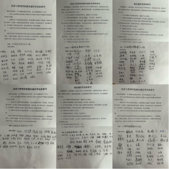 各年级辅导员通过召开诚信考试主题班会,强调了诚信考试的重要性与考试作弊的严重后果,带领同学们共同学习<<淮北理工学院学生手册>>学生违纪处理办法第二十五条考试相关规定,引导同学们认真复习,警示大家要防微杜渐,预防和遏制作弊、受处分现象发生,并让学们签署了诚信考试承诺书,形成“我诚信-我自豪,诚信考试”的良好氛围。