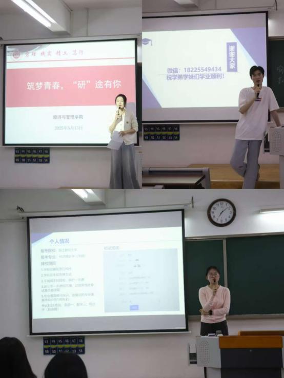 分享会上,成功上岸浙江财经大学经济统计学专业的费梦学姐聚焦“院校与专业选择”,建议学弟学妹从学科实力、地域发展等维度评估自身与目标院校的匹配度,尤其针对跨考生提出“先夯实专业基础再拓展真题训练”的建议。上岸浙江财经大学国际商务专业的罗潘伟学长及成功被安徽建筑大学公共管理专业录取的甘瑞学姐分别围绕复试礼仪、调剂策略及跨专业备考心态调整等模块展开分享,结合自身经历阐释“拆解公共课与专业课的复习节奏”“调剂期每日关注五所院校招生网”等实用经验。