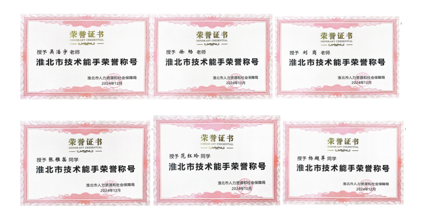 近日,经淮北市人力资源和社会保障局认定,永利官网教师吴浩宇、徐畅、刘岗,学生张雅菡、范红玲、杨超萍6名师生荣获“淮北市技术能手”荣誉称号。他们凭借扎实的专业素养和优异的实战能力,成功获此殊荣,为学校赢得了崇高荣誉,充分展现了永利官网在技能人才培养方面的显著成效。