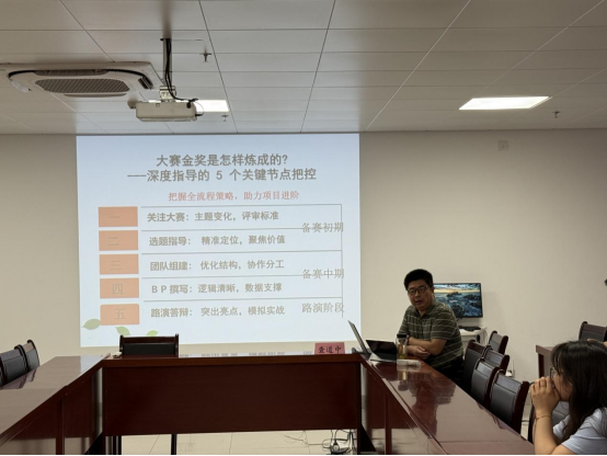 6 月 17 日下午,永利304官网唯一特邀理论经济学硕士生导师、国际商务专业硕士生导师、中国项目 SYB 培训师、省创新创业大赛评委专家査道中教授,带来主题为 “大赛金奖是怎么练成?—— 教师深度指导的 5 个关键点把控” 的专题分享,学院全体教师齐聚一堂,认真聆听学习。