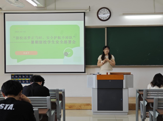 会议伊始,书记助理员禹辛围绕暑期安全教育、管理机制与纪律要求发表讲话。她从宿舍安全、校外安全及生活心理健康三个维度进行了全面强调,要求留校学生务必筑牢思想防线,切实防范各类风险;以“学校-学院-辅导员”三级联动机制全方位守护留校学子安全;明确晚22:00的门禁制度,并详细介绍了针对违纪行为的三级关怀式提醒机制,结合典型案例警示学生务必严守安全红线。