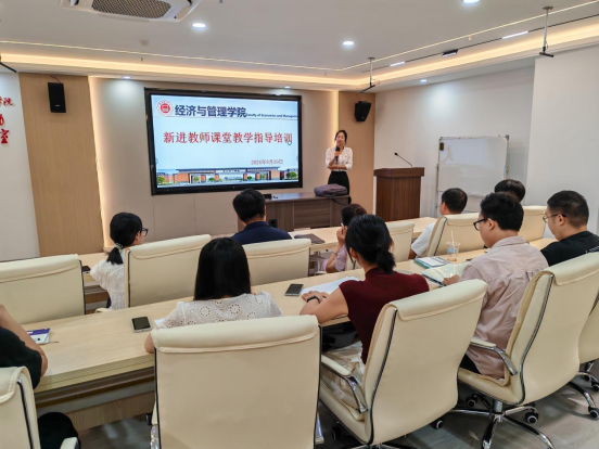 培训中,王胜男老师先向新进教师展开教学指导,王胜男老师从教什么,怎么教两个方面为新进教师培训,提出新进教师要注重情景导入、语言艺术和课堂时间分配。同时,王老师借自己主讲的《市场营销学》为新进教师展开15分钟的示范课堂,王老师从“黑神话—悟空”游戏发布作为情景导入,从瑞幸公司与黑神话—悟空联名营销大卖作为切入点,从而引入学生对市场的思考,最后再介绍了市场营销的概念和提出了一个案例进行分析。王老师从课程规范的角度为新进教师做了很好的示范工作。