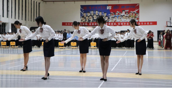 此次活动分为两个环节。第一环节,10支参赛队伍依次登台,进行形体礼仪展演。同学们以规范优雅的蹲姿、挺拔自信的站姿、从容稳健的走姿,配合标准的引导手势和鞠躬礼仪,巧妙地将红色文化元素融入礼仪展演中,在动静之间诠释礼仪之美,全方位展现了当代大学生内外兼修的礼仪素养。其中,2024级电子商务对口2班凭借整齐划一的队形变换、昂扬向上的精神风貌以及专业规范的礼仪动作,荣膺冠军。