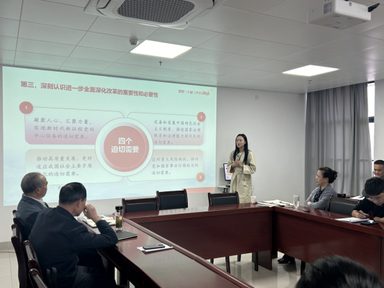 辅导报告邀请淮北市委宣讲团成员、马克思主义学院教师孙澄澄作了题为《学习贯彻党的二十届三中全会精神》的专题辅导报告。孙澄澄老师从深刻认识党的二十届三中全会重大意义、深入学习领会习近平总书记在全会上的重要讲话精神、全面准确理解《决定》提出的进一步全面深化改革重大举措及全力推动全会精神在学校落地落实四个方面进行专题,并号召与会教师认真学习二十届三中全会主要内容,锐意进取、开拓创新,攻坚克难、埋头苦干,在新征程上奋力谱写学校、学院高质量发展新篇章。