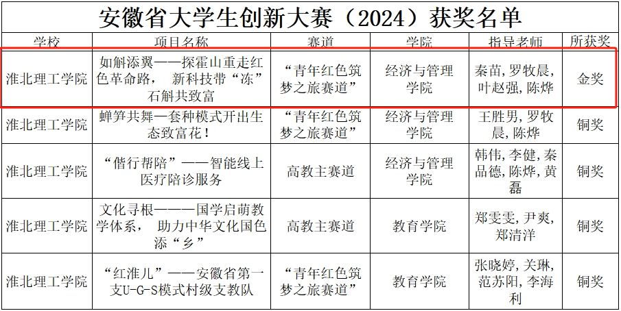 日前,由安徽省省教育厅、合肥市人民政府、安庆市人民政府和芜湖市人民政府联合主办,合肥工业大学、合肥大学、安庆师范大学、安徽机电职业技术学院和合肥市教育局共同承办的安徽省大学生创新大赛(2024)落下帷幕。经过学院初赛和学校推荐的永利官网五支团队参加了包括高教主赛道、“青年红色筑梦之旅”赛道(简称“红旅赛道”)的总决赛,最终来自经管学院的《如斛添翼——探霍山重走红色革命路,新科技带“冻”石斛共致富》项目以其立意新颖、汇报精彩而脱颖而出,荣获安徽省红旅赛道创意组金奖,其余四支团队荣获铜奖,实现了历史性突破。
